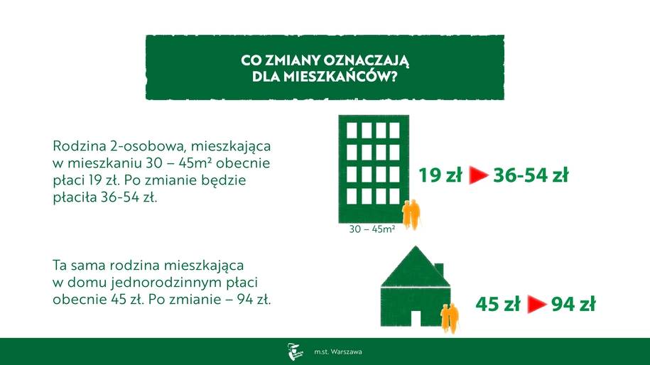 Zgodnie ze wstępnymi przekazanymi przez wiceprezydent stolicy Michała Olszewskego w nowym roku spodziewane są radykalne podwyżki cen z odbiór śmieci. Rozważane są zmiany w stawkach. Im większe mieszkania, tym stawka rośnie. 1,20 zł zapłacimy za metr, jeśli mieszkanie ma do 60 metrów kwadratowych, jeżeli mieszkanie ma między 60 a 120 metrów kwadratowych, to za każdy dodatkowy metr zapłacimy 88 groszy. 56 groszy wyniesie opłata za każdy dodatkowy metr, jeżeli metraż wynosi powyżej 120 metrów kwadratowych. Rodzina w 80-metrowym mieszkaniu zapłaci więc 89 złotych. Teraz płaci 37 zł.