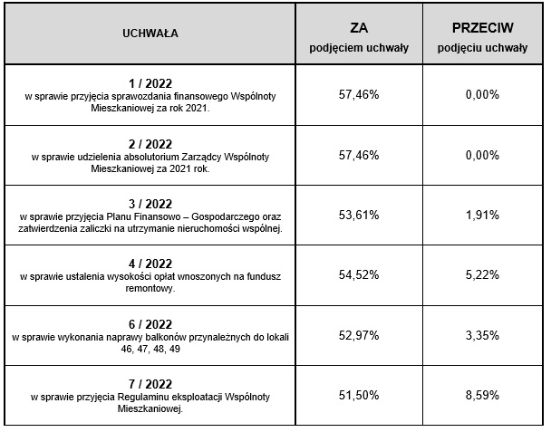 Zgodnie z art. 23. Ust. 1 pkt 3 Ustawy z dnia 24 czerwca 1994r. o własności lokali Zarządca Wspólnoty Mieszkaniowej przy ul. Polkowskiej 11 w Warszawie zawiadamia, że w trybie indywidualnego zbierania głosów do dnia 05.10.2022 r. podjęto n/w uchwały:
