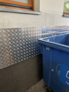Informujemy, że w pomieszczeniu śmietnika została zamontowana metalowa osłona zabezpieczająca ścianę przed uszkodzeniami mechanicznymi powstającymi podczas użytkowania pojemników na odpady.