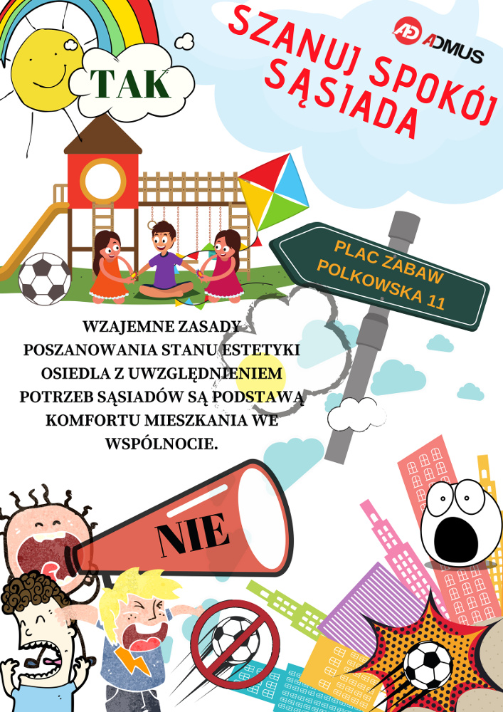 Szanowni Państwo na terenie obu nieruchomości (Polkowska 11 i Chełmska 9) znajdują się dwa place zabaw, w związku z faktem, iż jeden z nich (Polkowska 11) znajduje się bardzo blisko okien budynku, mieszkańcy Wspólnoty Mieszkaniowej Polkowska 11 uprzejmie proszą o zachowanie spokoju.