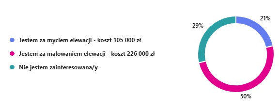 Poniżej przedstawiamy wyniki ankiety dotyczącej remontu elewacji. Większość osób ankietowanych zdecydowała o malowaniu elewacji. Po konsultacji z Radą Osiedla temat remontu elewacji będzie omawiany na rocznym zebraniu wspólnoty. Z uwagi na brak odpowiedniej kwoty na funduszu remontowym Rada Osiedla rekomenduje wstrzymanie się od inwestycji do czasu zgromadzenia odpowiedniej kwoty.